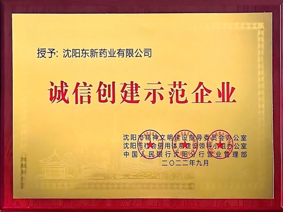 2023年3月15日,沈(shen)陽(yang)(yang)市(shi)文明辦、沈(shen)陽(yang)(yang)市(shi)信(xin)(xin)(xin)(xin)用辦在沈(shen)陽(yang)(yang)舉行了“沈(shen)陽(yang)(yang)市(shi)誠(cheng)(cheng)信(xin)(xin)(xin)(xin)創建(jian)示范(fan)(fan)單(dan)位授牌暨2023年誠(cheng)(cheng)信(xin)(xin)(xin)(xin)創建(jian)活動啟動儀(yi)式”。沈(shen)陽(yang)(yang)東(dong)新藥(yao)業(ye)(ye)(ye)有限公司被授予“誠(cheng)(cheng)信(xin)(xin)(xin)(xin)創建(jian)示范(fan)(fan)企業(ye)(ye)(ye)”的(de)稱號。這是社會(hui)、行業(ye)(ye)(ye)、市(shi)場對東(dong)新藥(yao)業(ye)(ye)(ye)誠(cheng)(cheng)信(xin)(xin)(xin)(xin)經(jing)營的(de)充分肯定及高度評價。東(dong)新藥(yao)業(ye)(ye)(ye)將一(yi)如既(ji)往的(de)誠(cheng)(cheng)信(xin)(xin)(xin)(xin)履約、規范(fan)(fan)管(guan)理,打造最值得信(xin)(xin)(xin)(xin)賴的(de)企業(ye)(ye)(ye)和最可(ke)靠的(de)產品。